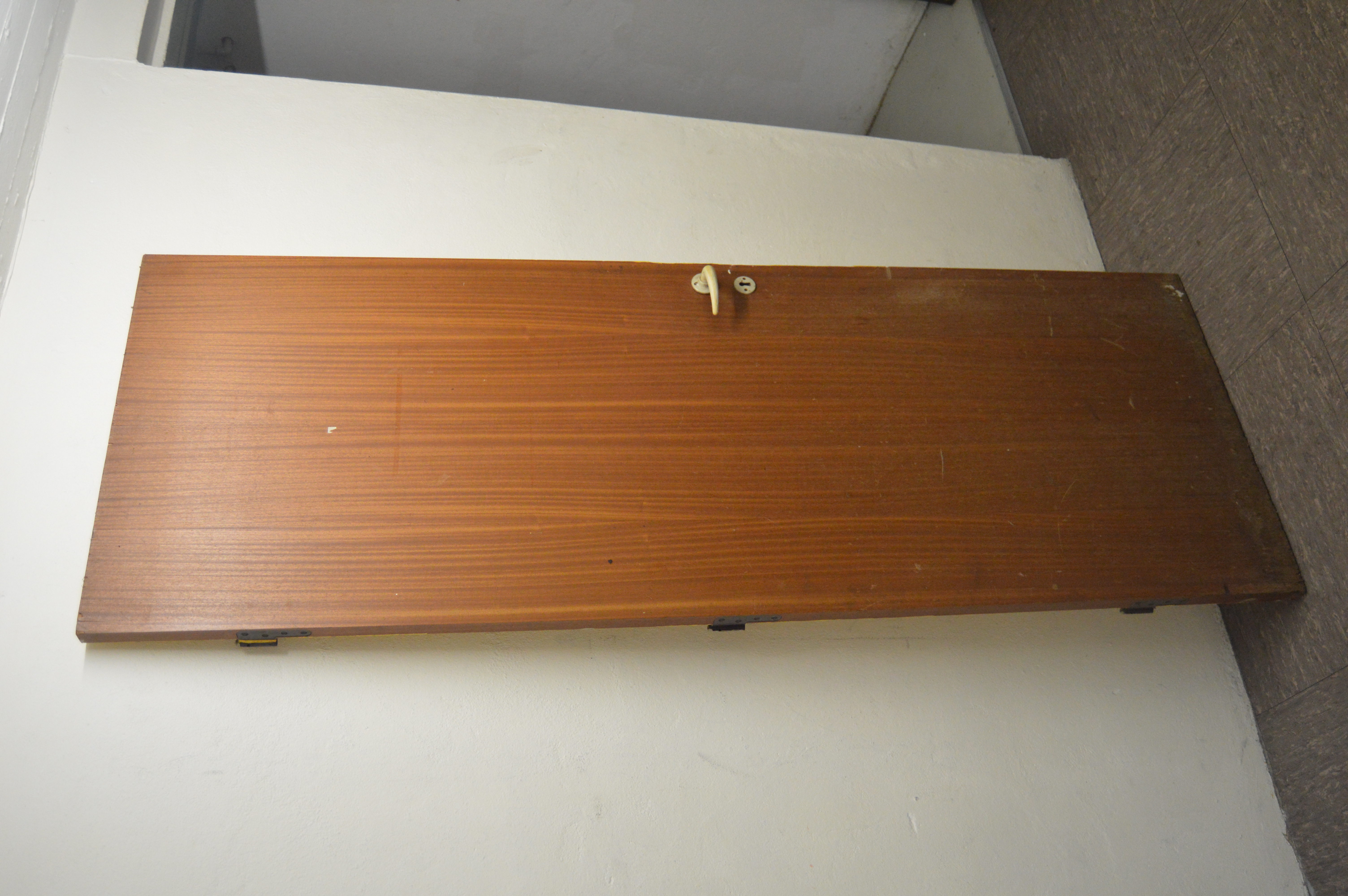 DESCRIPTIONSurface covered in delicate mahogany veneer with a repetitive pattern. It is very robust and has a keyhole and handle in grey plastic and metal hinges on one edge