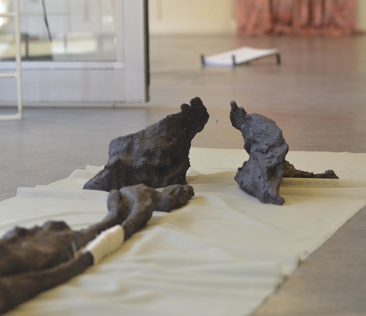 Human sweat, bread, olive oil, seaweed (harvested), beetroot, salt, beer, moss, bark, plants (withered), cone, horse bone, cheese wax, soil, sand, stoneware, timber, rock, brick, mortar, cardboard, paper, cigarette pack (reused), suit (reused), curtain (found), foam mattress (reused), drinking glasses (reused), glass plate (reused), porcelain plates (reused), metal cans, backpack frame (reused), steel plate, steel metal chains, screw bolt, metal screws, flat iron, operation scissors, raw plugs, plastic barrel (reused), plastic fan, id-card (reused, tarp, wig, signboard (plastic/metal frame), plastic bag, zip tie, yoga mat, pigment, glazing (pottery), spray paint, oil paint, polyester, stickers